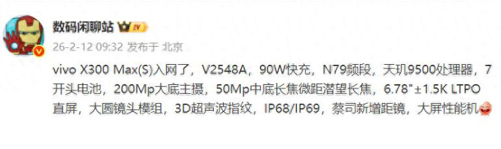来自行业人士“数码闲聊站”的消息显示,vivo X300 Max(s)已经入网了。他之所以这么讲可能是还没有确定命名方式,不过以现在行业的大趋势肯定是vivo X300 Max了。怪异的是这款机型还是基于联发科天玑9500处理器打造的,而不是天玑9500+,难道……支持N79频段,支持90W有线快充,无线充电肯定也不可能缺席。采用的是6.78英寸、1.5K分辨率、LTPO技术直屏设计,主摄为2亿像素大底传感器,潜望式长焦为5000万像素中底设计。相机模组还是大圆设计,支持3D超声波指纹。